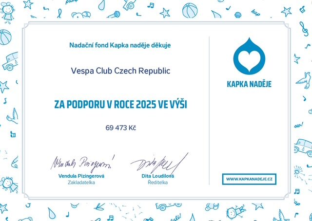 Vespa Club Praha obdržel milé poděkování od nadace Kapka naděje za finanční podporu, kterou jsme společně poskytli v loňském roce. Této zpětné vazby si velmi vážíme a rádi ji sdílíme se všemi členy a přáteli našeho klubu.
